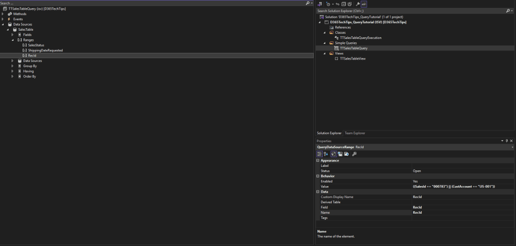 Another functionality that can get complex to create through AOT Queries is an OR condition based on different fields. As we have mentioned in the previous part of this blog series, the default behaviour for multiple ranges on the same datasource is to perform an AND condition. So, how can we perform an OR condition?