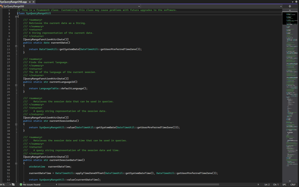 Throughout F&O that are some classes which are designed to create queries specifically for this purpose. These cover the most basic scenarios such as empty strings and date ranges. The two most used classes are the SysQuery and SysQueryRangeUtil classes. Taking a look at the SysQueryRangeUtil, we can see that this class offers several methods which are designed to cater for the most common filtering scenarios.