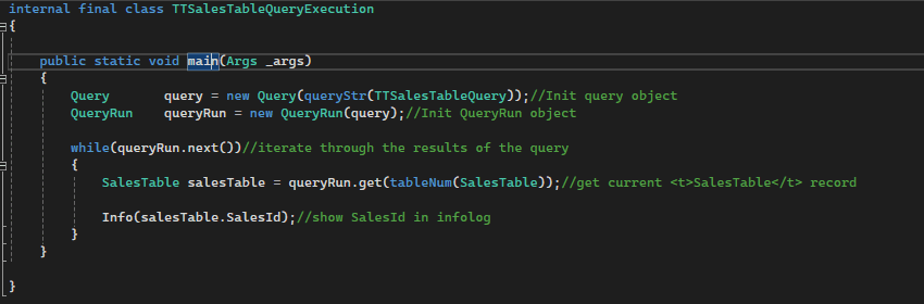As has been mentioned in the previous blog post, one of the benefits of using AOT Queries is that these can also be referenced in X++ code. In order to do this, a Query object must be initialised from the AOT Query element. This is done executed using the QueryRun class. An example of how this can be performed can be found below.