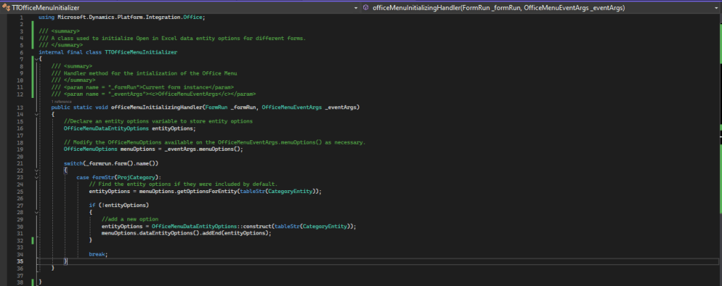 Now that we have a basic understanding of how this works, there may be some scenarios where another data entity must be added as an option to the Open in Excel list. In order to do so, there are a few steps that need to be done. In this scenario, the requirement is to add the CategoryEntity data entity to the ProjCategory form.